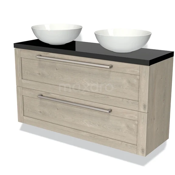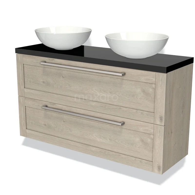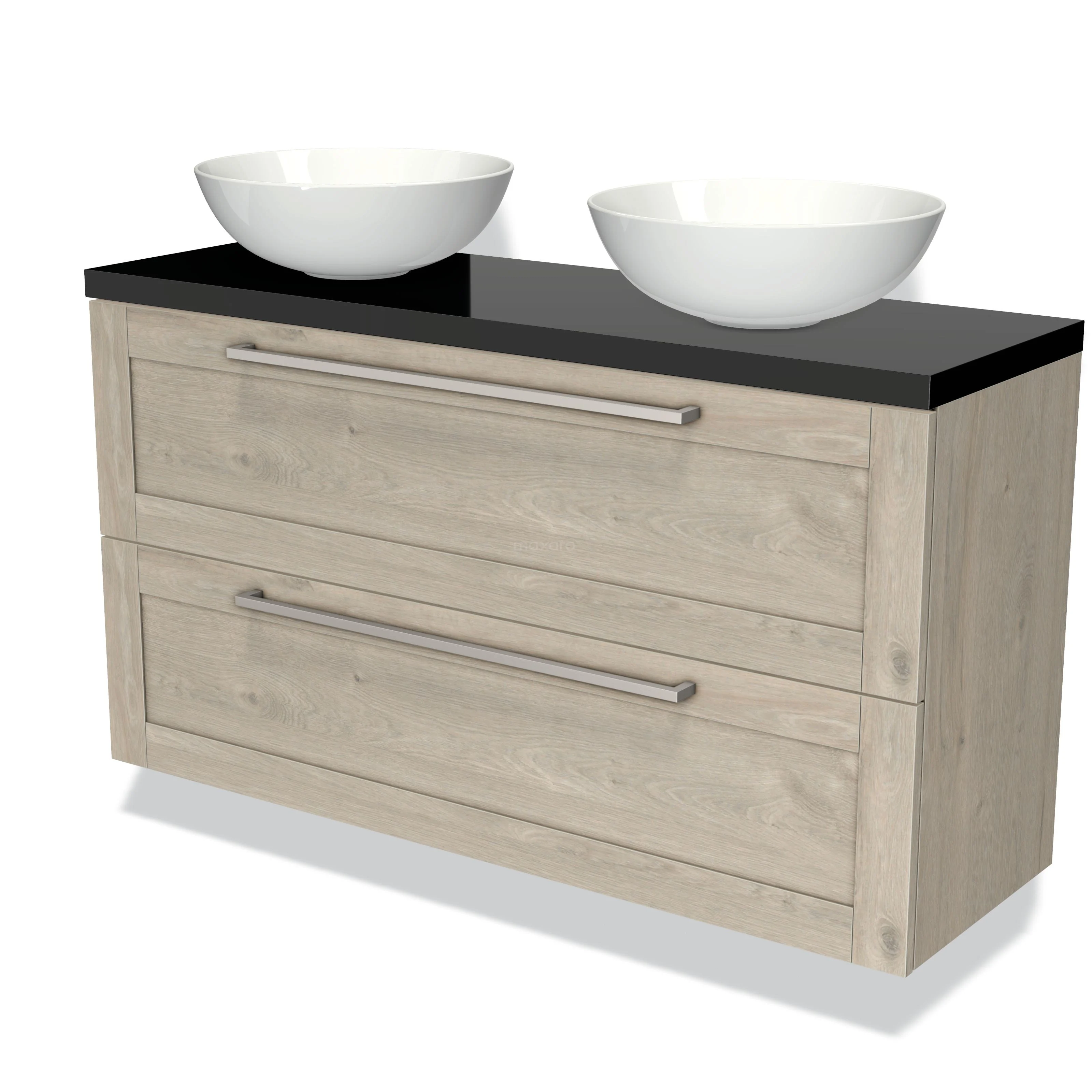 Modulo Plato Slim Badmöbel mit Aufsatzwaschbecken | 120 cm Hellgraue Eiche Rahmen front Hochglanz Schwarz blatt 2 übereinanderliegende Schubladen