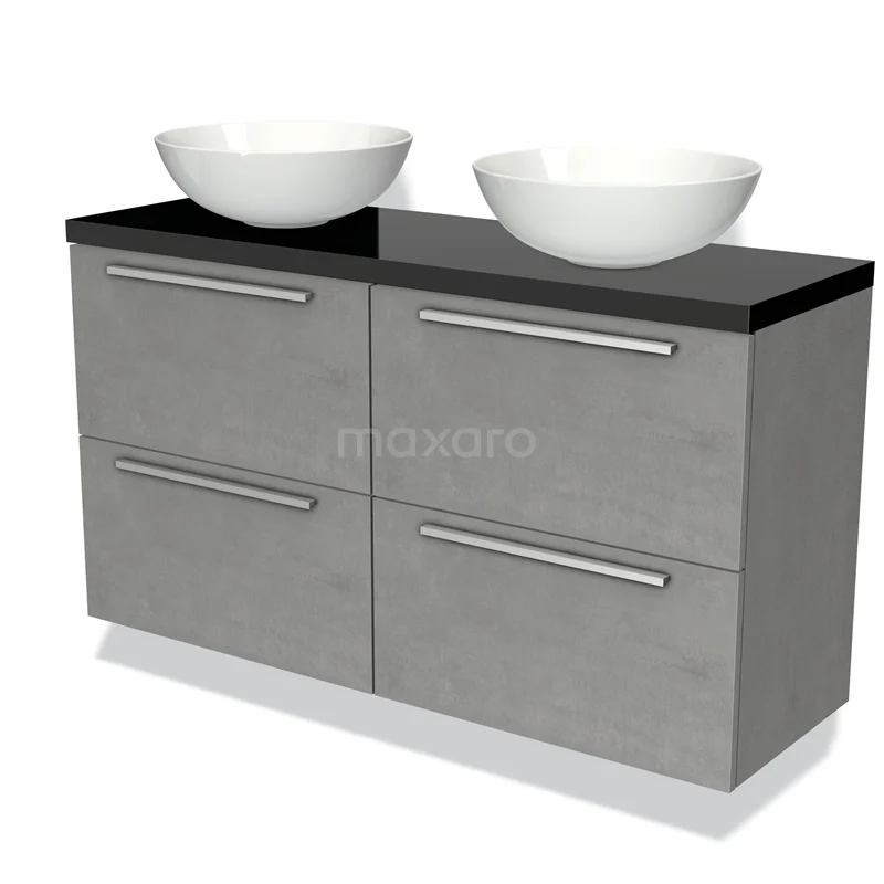 Modulo Plato Slim Badmöbel mit Aufsatzwaschbecken | 120 cm Hellgrauer Beton Flach front Hochglanz Schwarz blatt 4 Schubladen