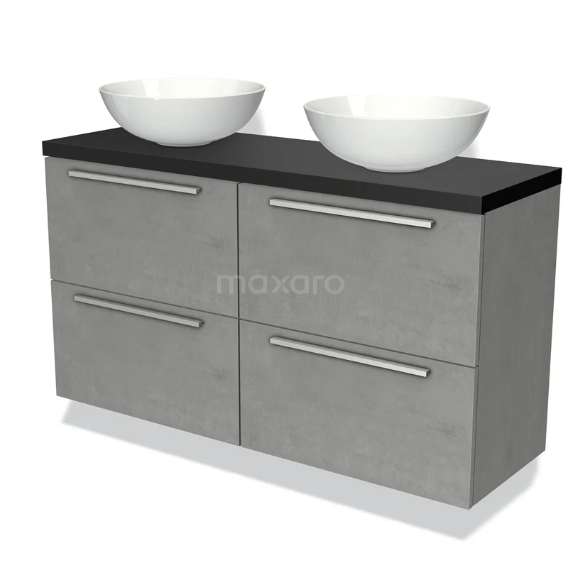 Modulo Plato Slim Badmöbel mit Aufsatzwaschbecken | 120 cm Hellgrauer Beton Flach front Matt Schwarz blatt 4 Schubladen