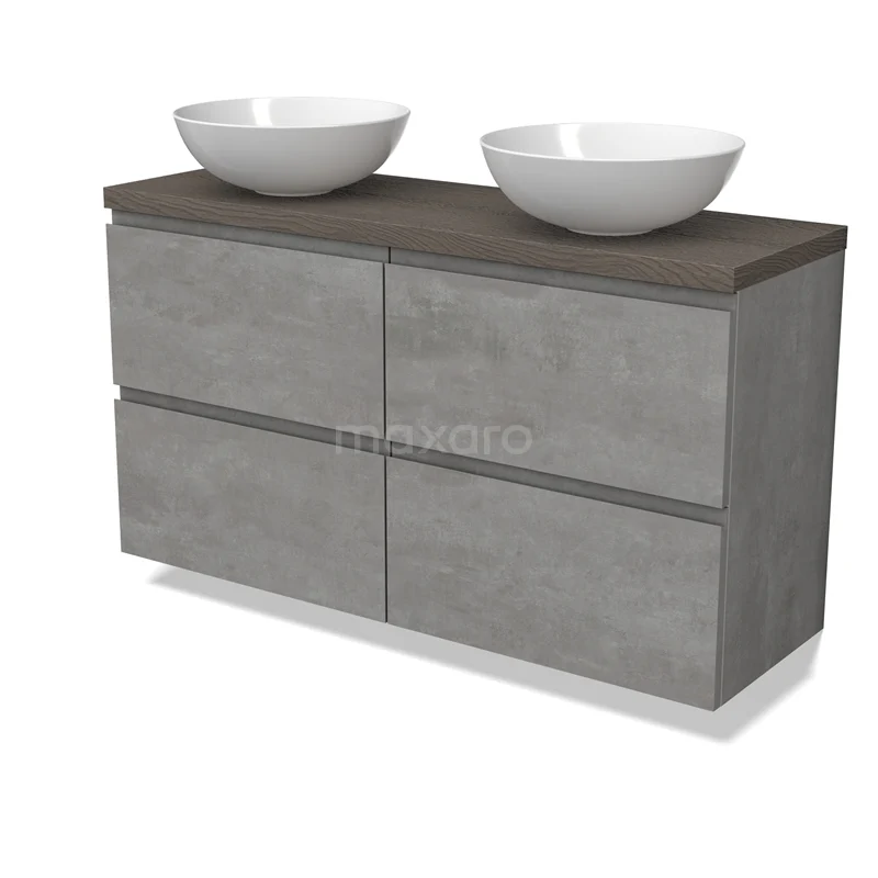 Modulo Plato Slim Badmöbel mit Aufsatzwaschbecken | 120 cm Hellgrauer Beton Grifflos front Dunkelbraune Eiche blatt 4 Schubladen