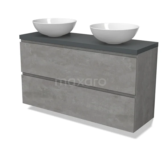 Modulo Plato Slim Badmöbel mit Aufsatzwaschbecken | 120 cm Hellgrauer Beton Grifflos front Dunkelgrau blatt 2 übereinanderliegende Schubladen