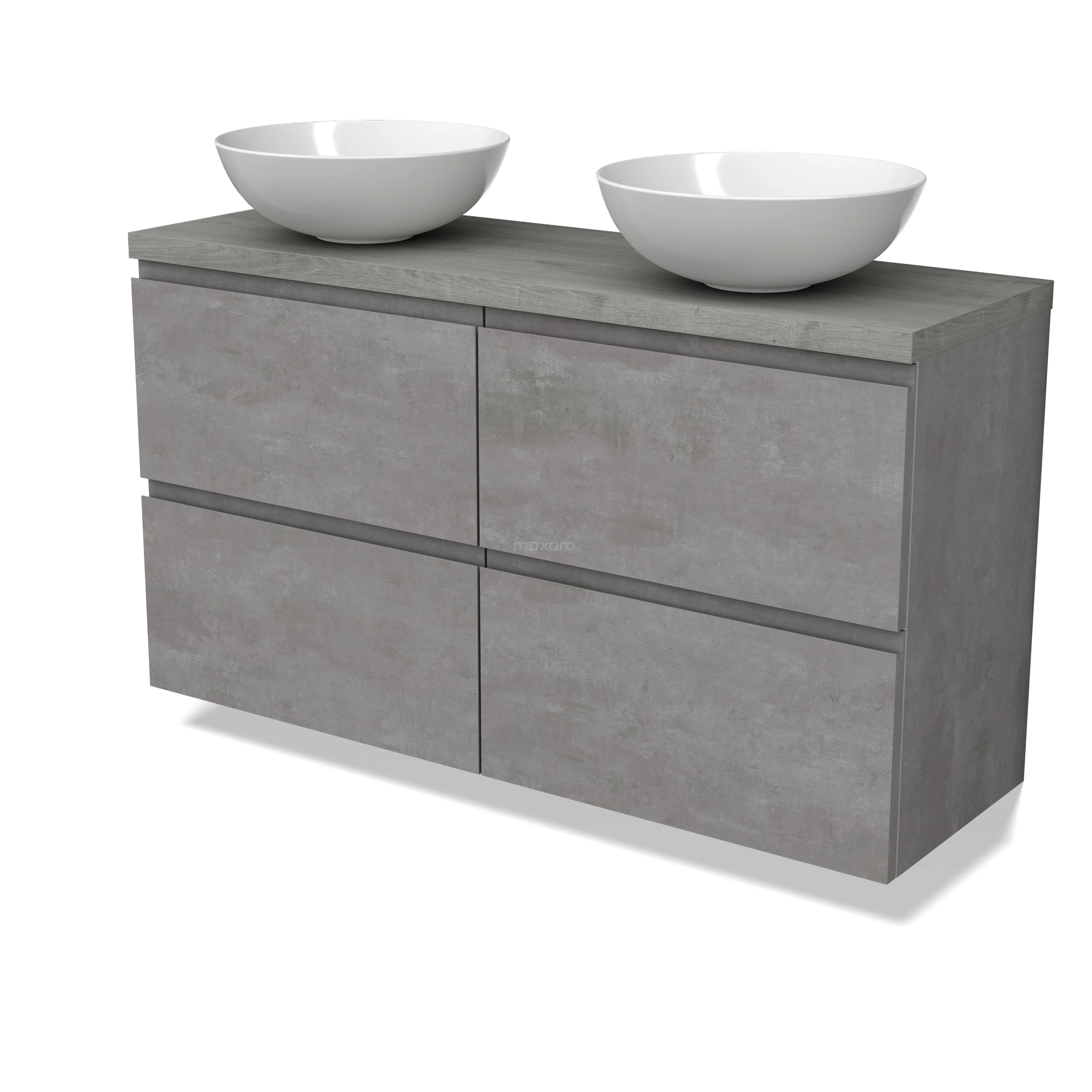 Modulo Plato Slim Badmöbel mit Aufsatzwaschbecken | 120 cm Hellgrauer Beton Grifflos front Graue Eiche blatt 4 Schubladen