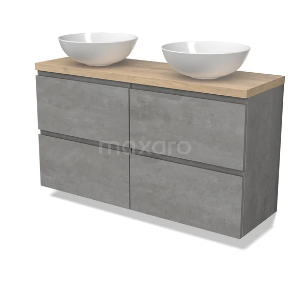 Modulo Plato Slim Badmöbel mit Aufsatzwaschbecken | 120 cm Hellgrauer Beton Grifflos front Hellbraune Eiche blatt 4 Schubladen