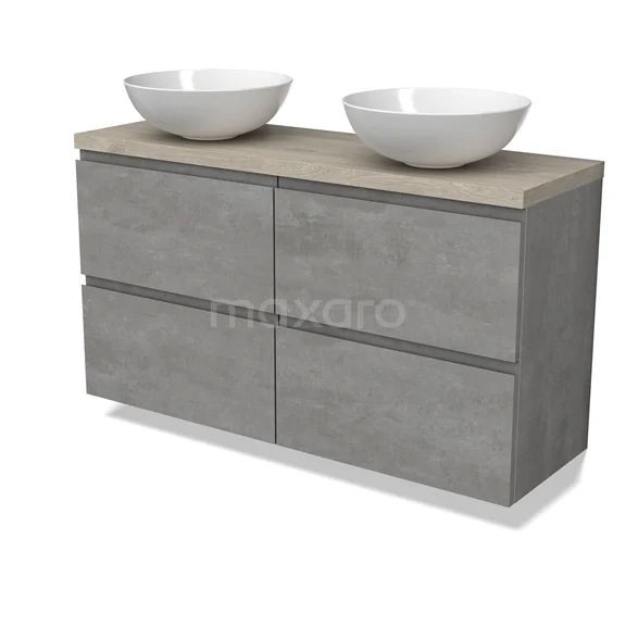 Modulo Plato Slim Badmöbel mit Aufsatzwaschbecken | 120 cm Hellgrauer Beton Grifflos front Hellgraue Eiche blatt 4 Schubladen