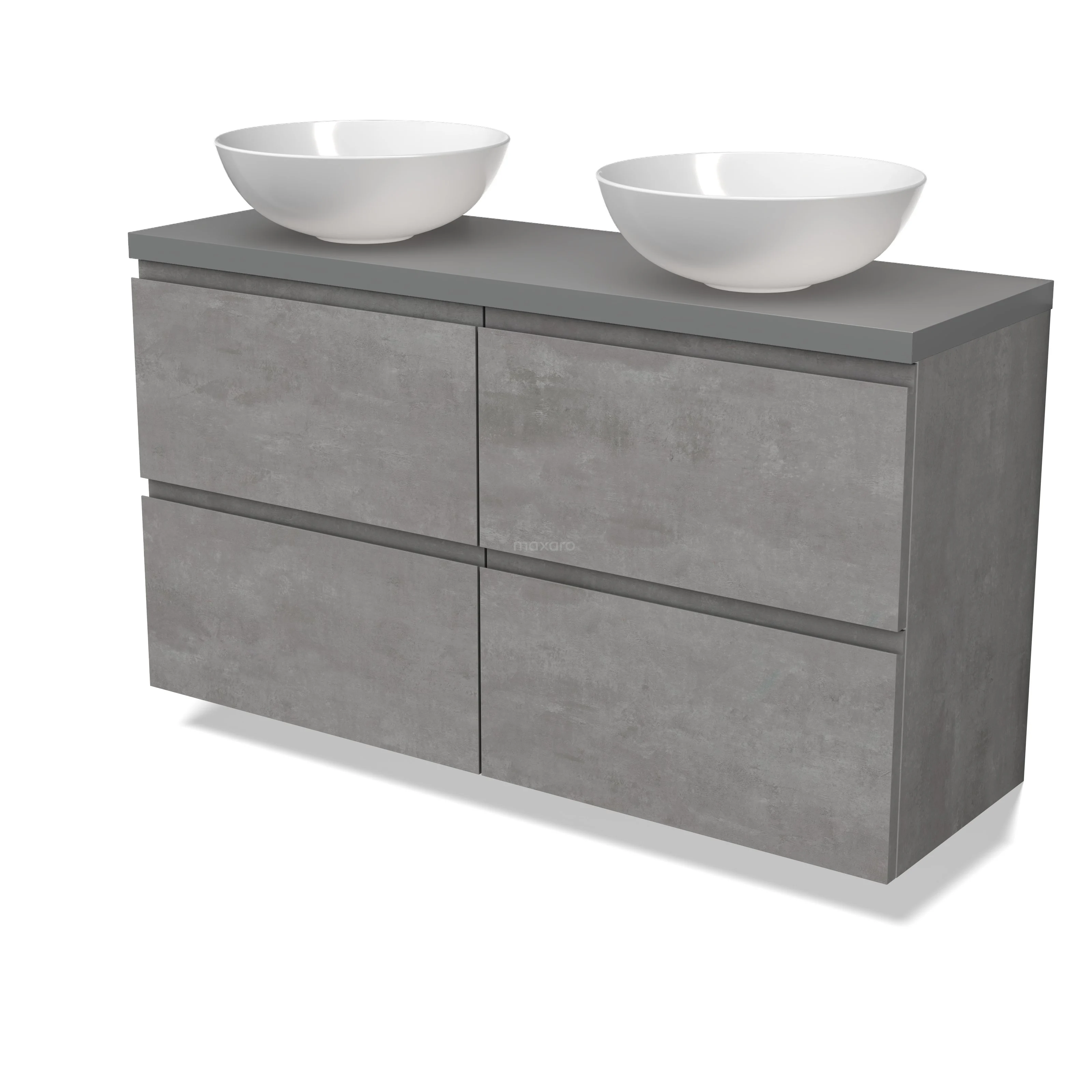 Modulo Plato Slim Badmöbel mit Aufsatzwaschbecken | 120 cm Hellgrauer Beton Grifflos front Mittelgrau blatt 4 Schubladen