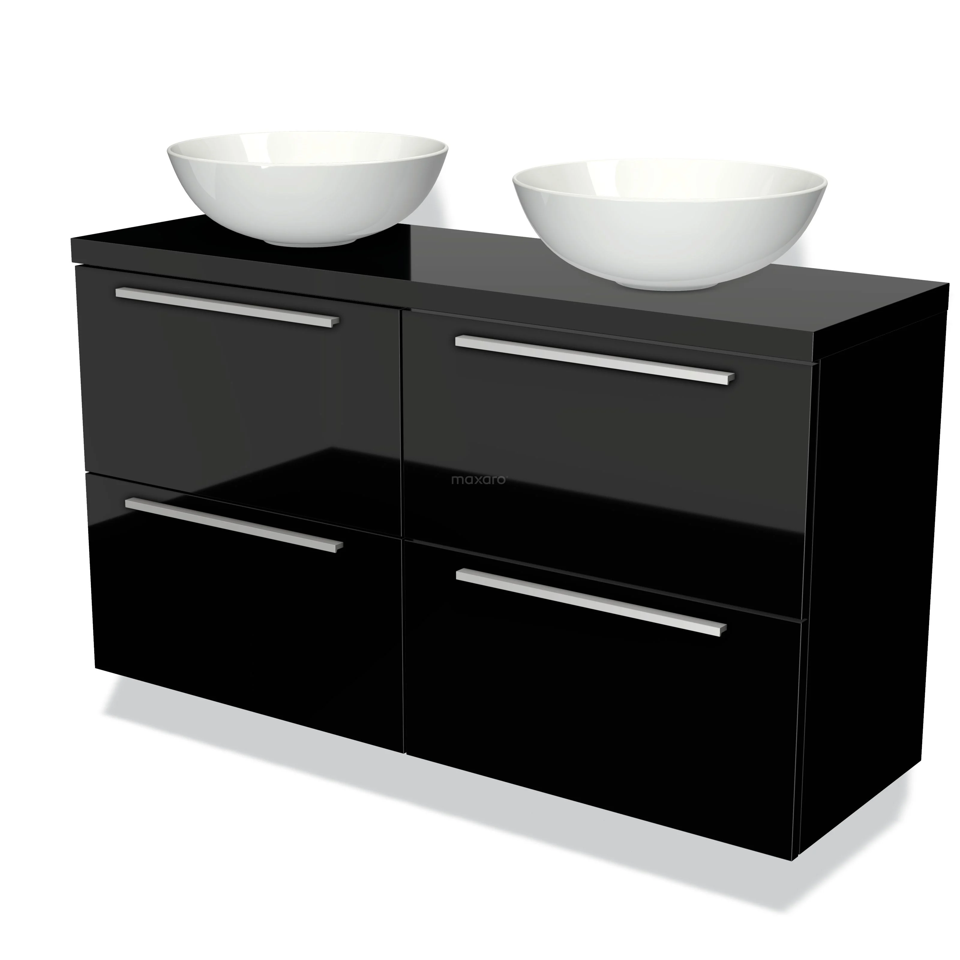 Modulo Plato Slim Badmöbel mit Aufsatzwaschbecken | 120 cm Hochglanz Schwarz Flach front Hochglanz Schwarz blatt 4 Schubladen