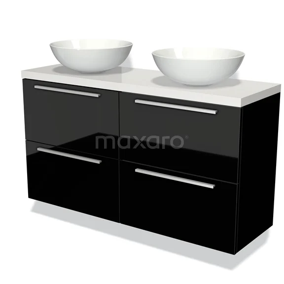 Modulo Plato Slim Badmöbel mit Aufsatzwaschbecken | 120 cm Hochglanz Schwarz Flach front Hochglanz Weiß blatt 4 Schubladen