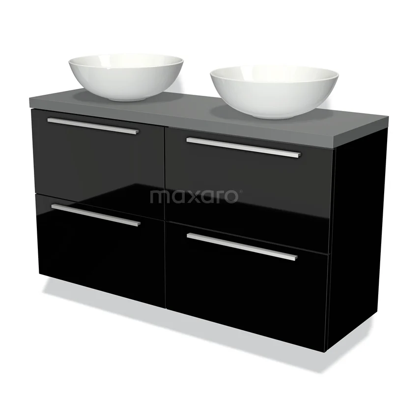 Modulo Plato Slim Badmöbel mit Aufsatzwaschbecken | 120 cm Hochglanz Schwarz Flach front Mittelgrau blatt 4 Schubladen