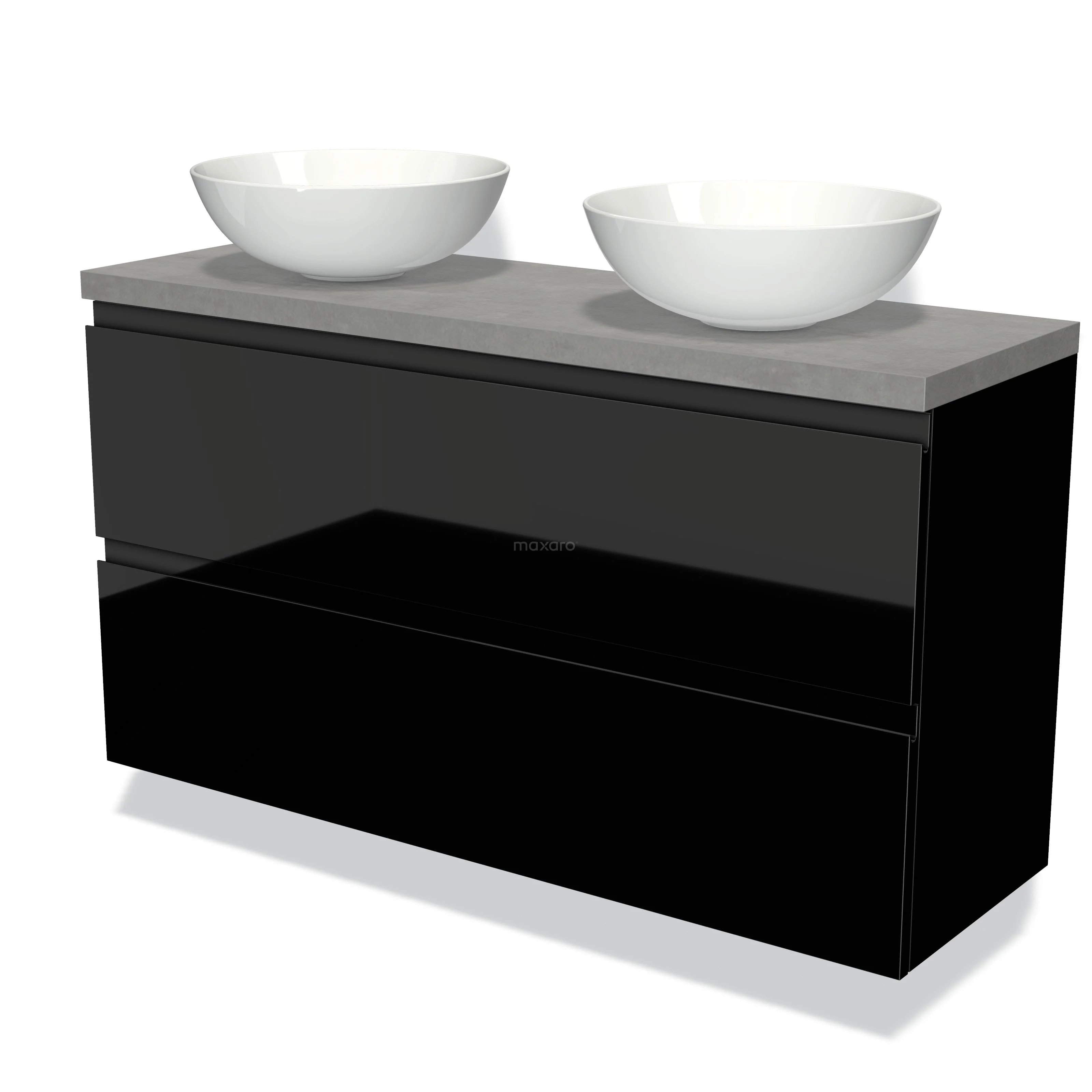 Modulo Plato Slim Badmöbel mit Aufsatzwaschbecken | 120 cm Hochglanz Schwarz Grifflos front Hellgrauer Beton blatt 2 übereinanderliegende Schubladen