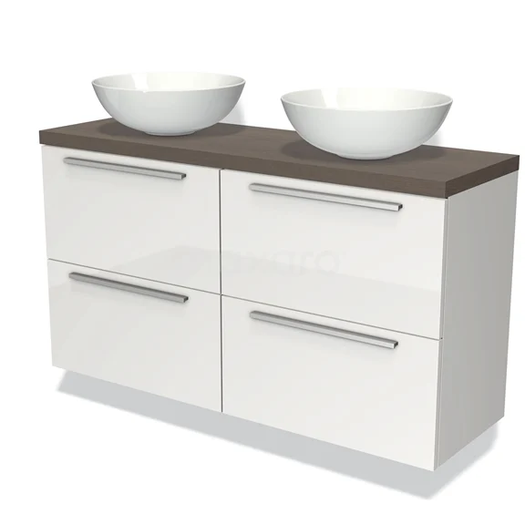 Modulo Plato Slim Badmöbel mit Aufsatzwaschbecken | 120 cm Hochglanz Weiß Flach front Dunkelbraune Eiche blatt 4 Schubladen