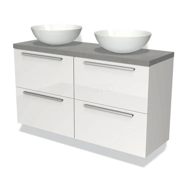 Modulo Plato Slim Badmöbel mit Aufsatzwaschbecken | 120 cm Hochglanz Weiß Flach front Hellgrauer Beton blatt 4 Schubladen