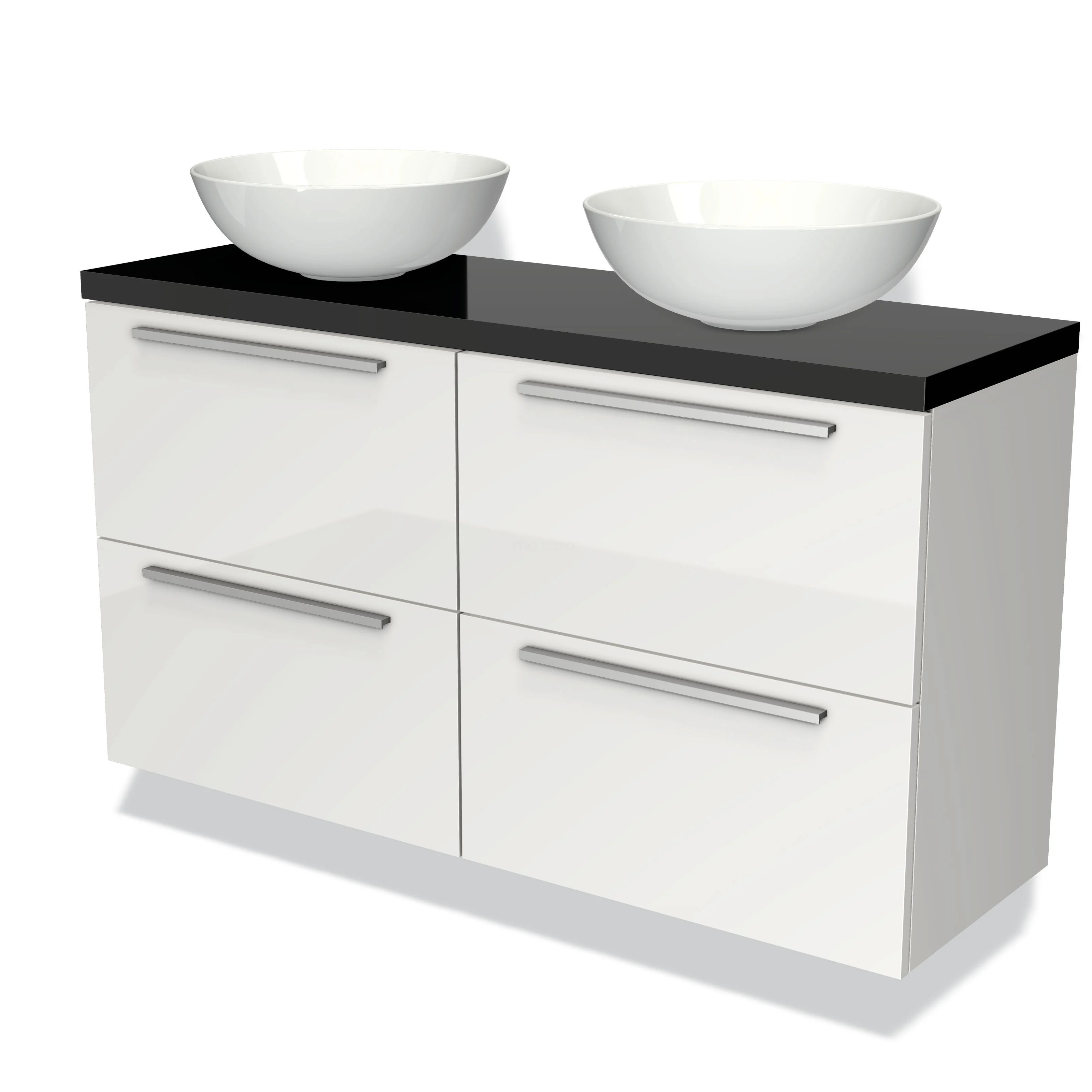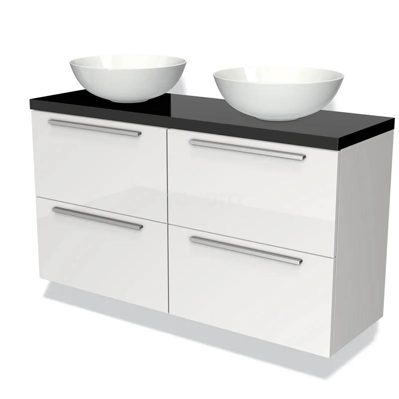 Modulo Plato Slim Badmöbel mit Aufsatzwaschbecken | 120 cm Hochglanz Weiß Flach front Hochglanz Schwarz blatt 4 Schubladen