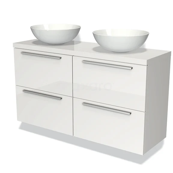 Modulo Plato Slim Badmöbel mit Aufsatzwaschbecken | 120 cm Hochglanz Weiß Flach front Hochglanz Weiß blatt 4 Schubladen