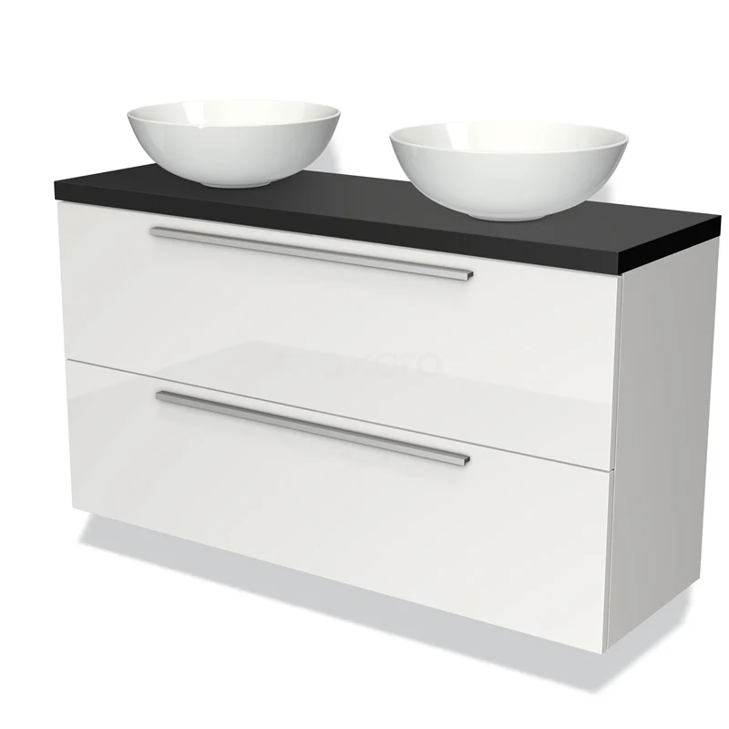 Modulo Plato Slim Badmöbel mit Aufsatzwaschbecken | 120 cm Hochglanz Weiß Flach front Matt Schwarz blatt 2 übereinanderliegende Schubladen