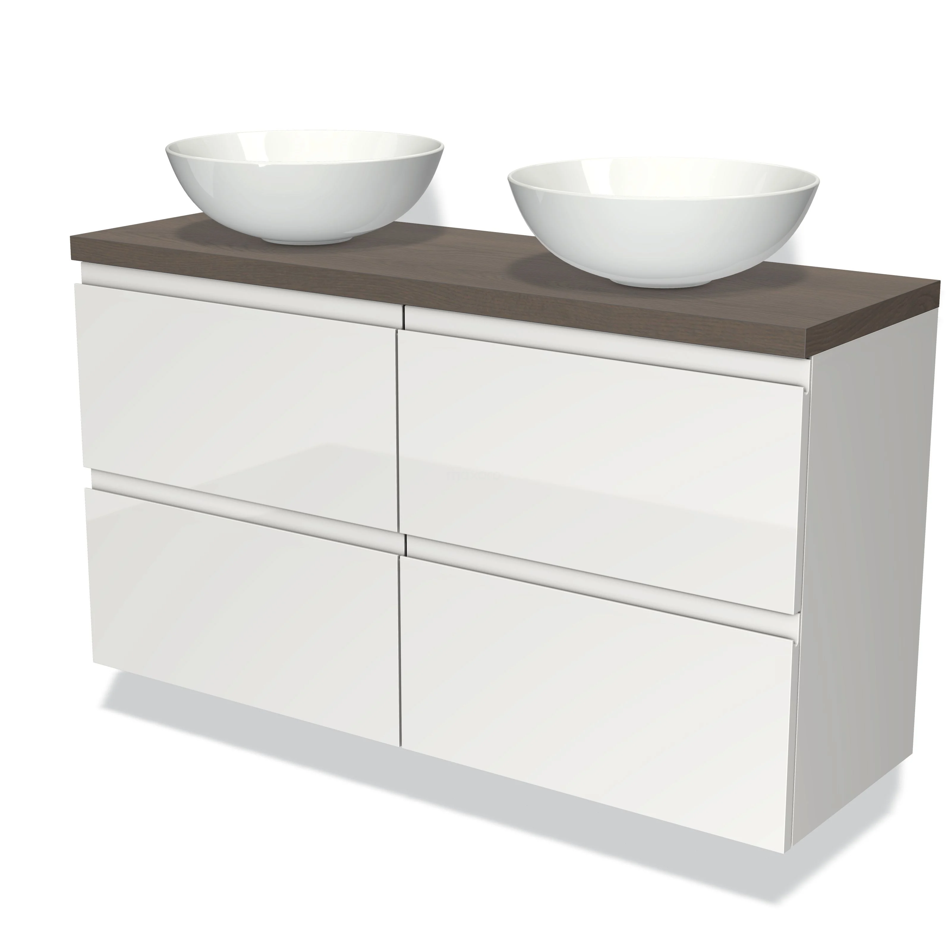 Modulo Plato Slim Badmöbel mit Aufsatzwaschbecken | 120 cm Hochglanz Weiß Grifflos front Dunkelbraune Eiche blatt 4 Schubladen