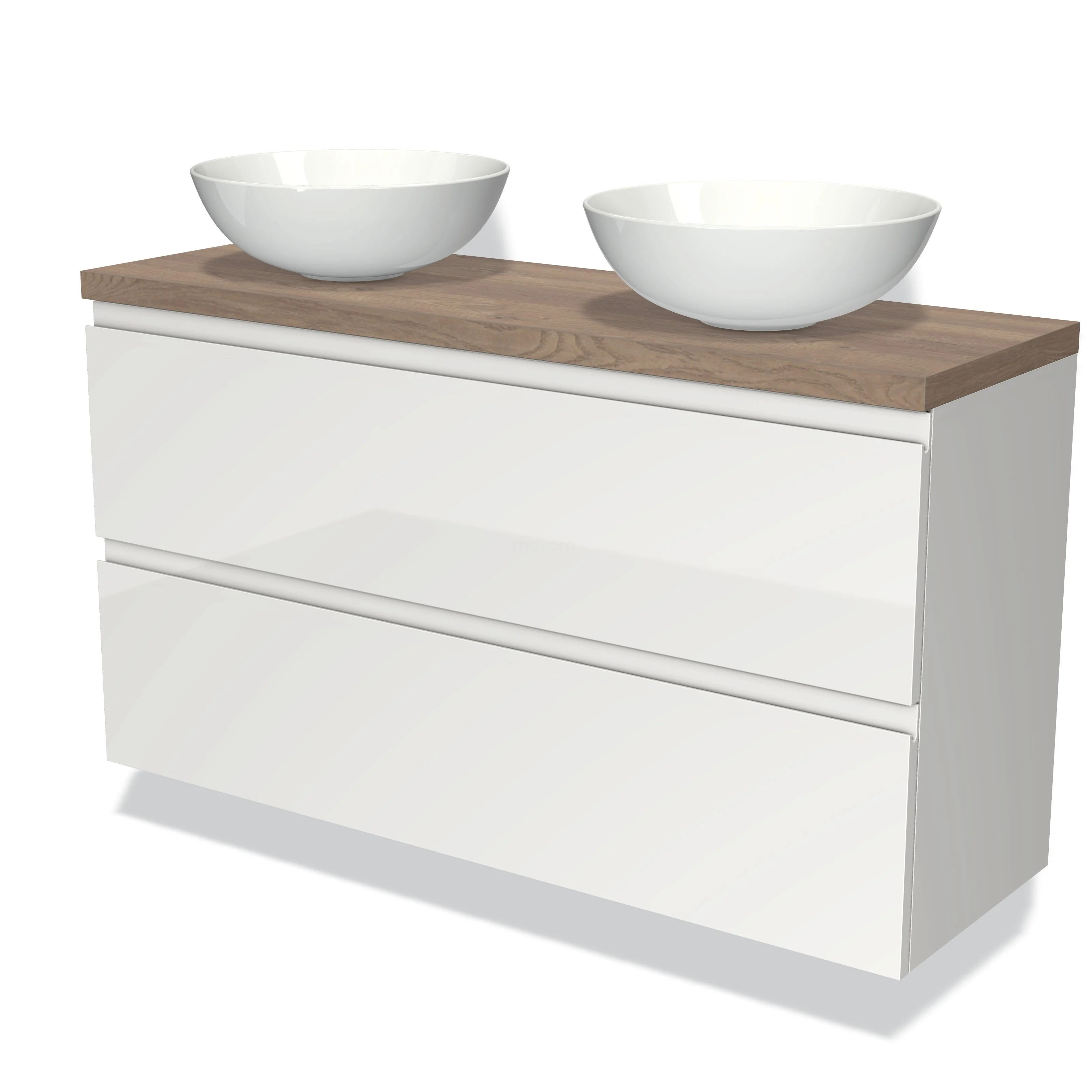 Modulo Plato Slim Badmöbel mit Aufsatzwaschbecken | 120 cm Hochglanz Weiß Grifflos front Mittelbraune Eiche blatt 2 übereinanderliegende Schubladen