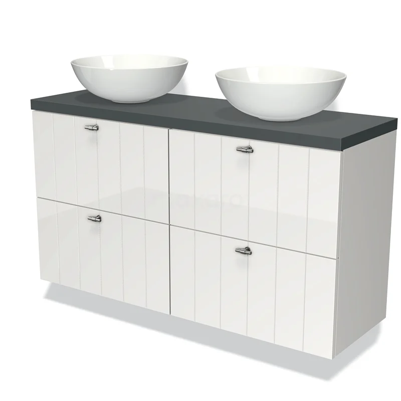 Modulo Plato Slim Badmöbel mit Aufsatzwaschbecken | 120 cm Hochglanz Weiß Lamelle front Dunkelgrau blatt 4 Schubladen