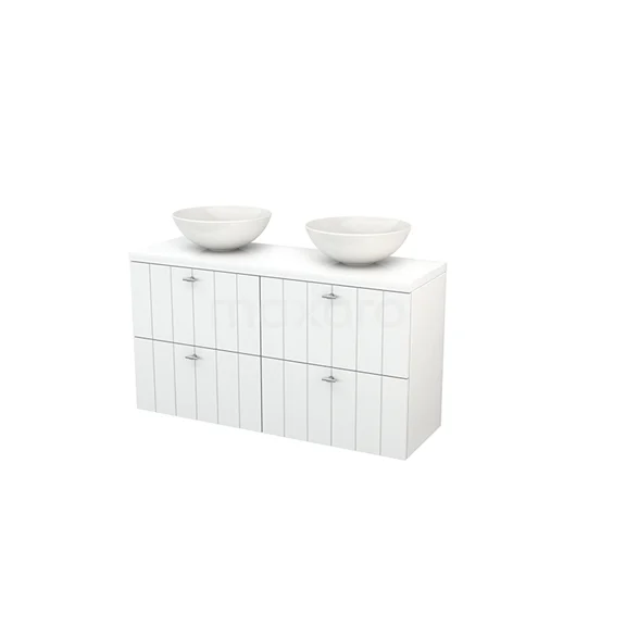 Modulo+ Plato Slim Badmöbel mit Aufsatzwaschbecken | 120 cm Hochglanz Weiß Lamelle front Hochglanz Weiß blatt 4 Schubladen