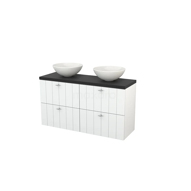 Modulo+ Plato Slim Badmöbel mit Aufsatzwaschbecken | 120 cm Hochglanz Weiß Lamelle front Kohlenstoff blatt 4 Schubladen