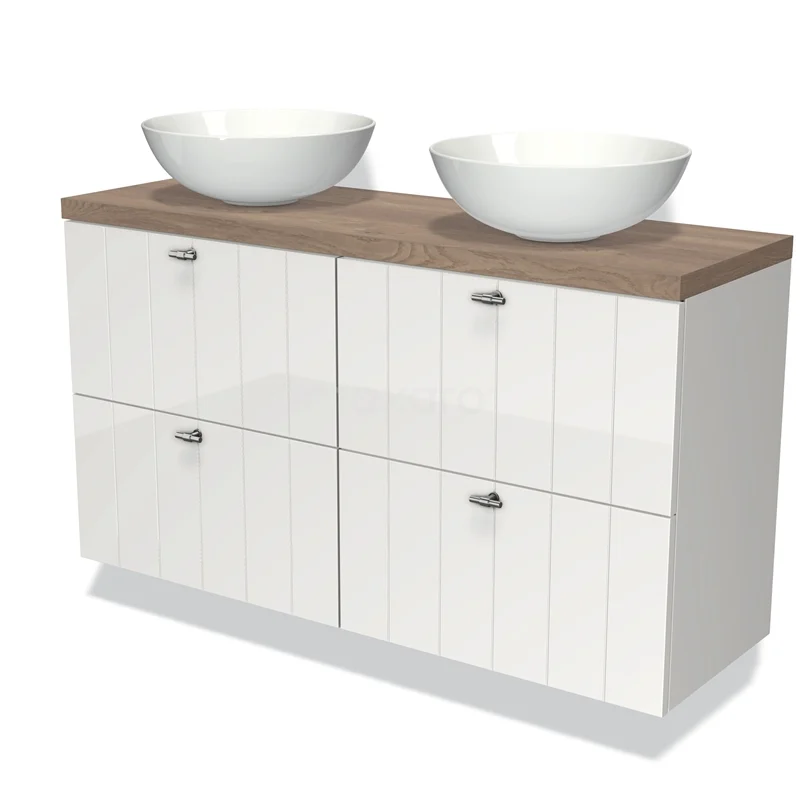 Modulo Plato Slim Badmöbel mit Aufsatzwaschbecken | 120 cm Hochglanz Weiß Lamelle front Mittelbraune Eiche blatt 4 Schubladen