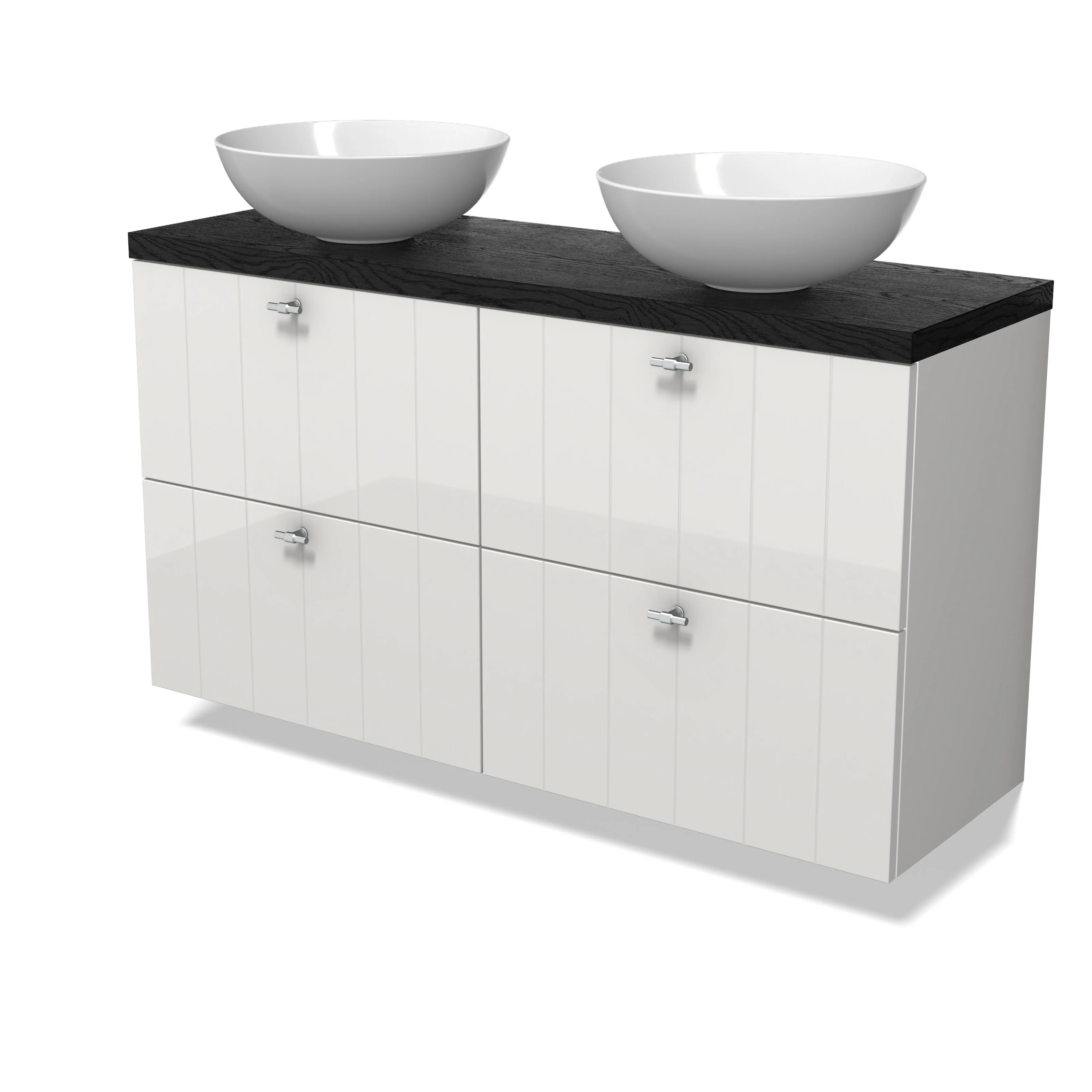 Modulo Plato Slim Badmöbel mit Aufsatzwaschbecken | 120 cm Hochglanz Weiß Lamelle front Schwarze Eiche blatt 4 Schubladen