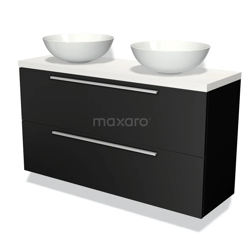 Modulo Plato Slim Badmöbel mit Aufsatzwaschbecken | 120 cm Matt Schwarz Flach front Matt Weiß blatt 2 übereinanderliegende Schubladen
