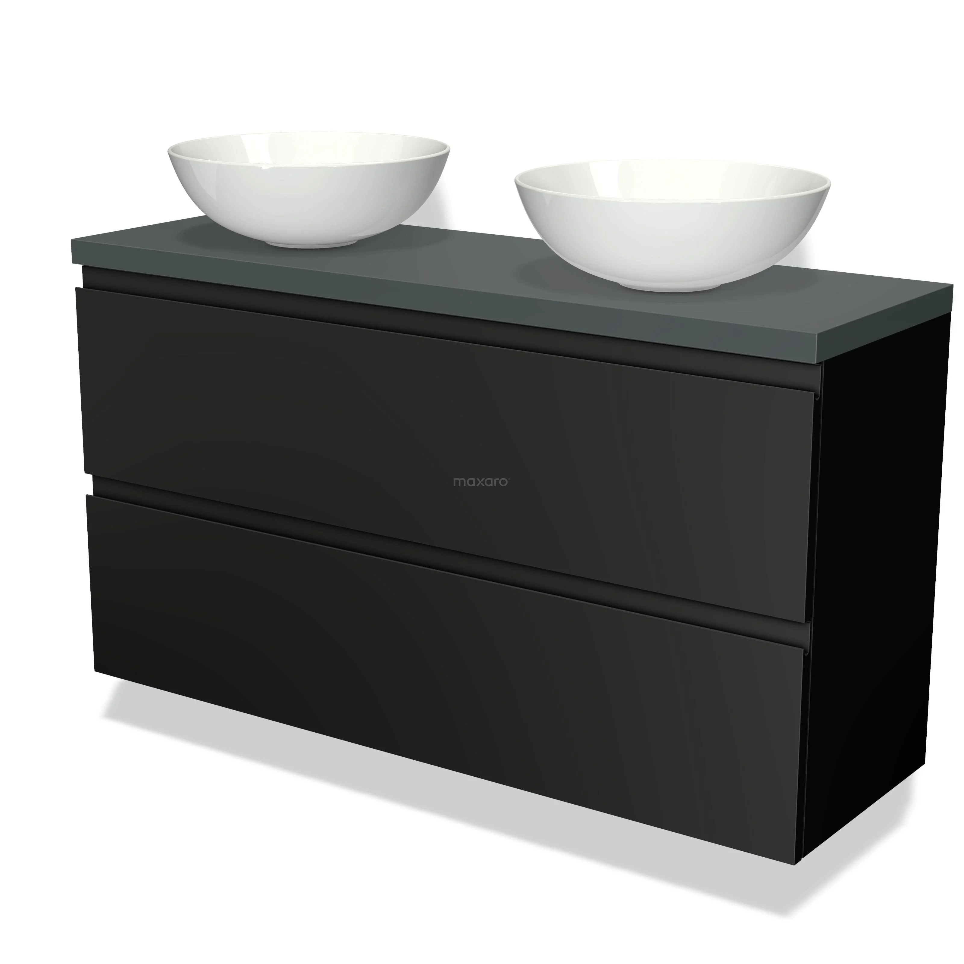Modulo Plato Slim Badmöbel mit Aufsatzwaschbecken | 120 cm Matt Schwarz Grifflos front Dunkelgrau blatt 2 übereinanderliegende Schubladen