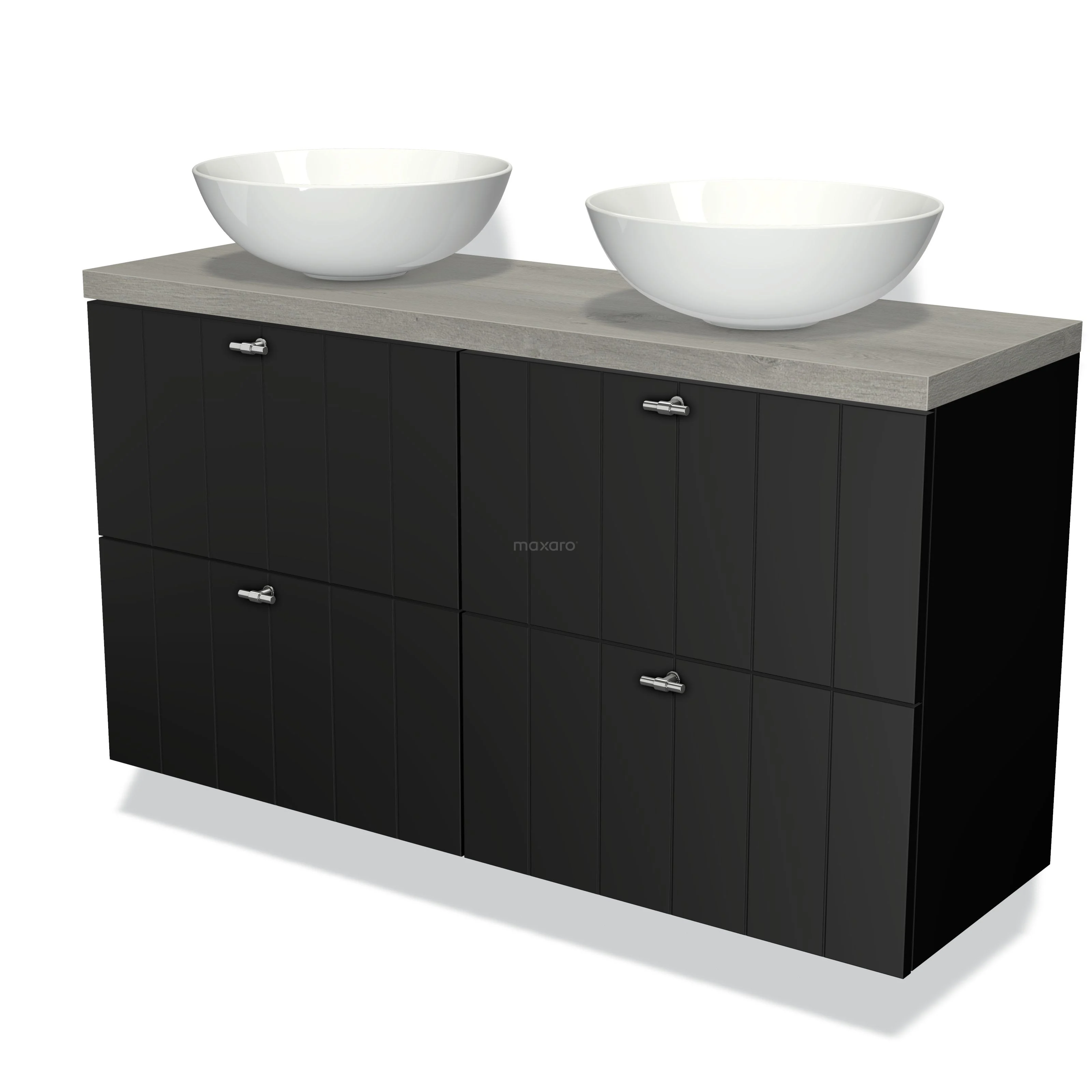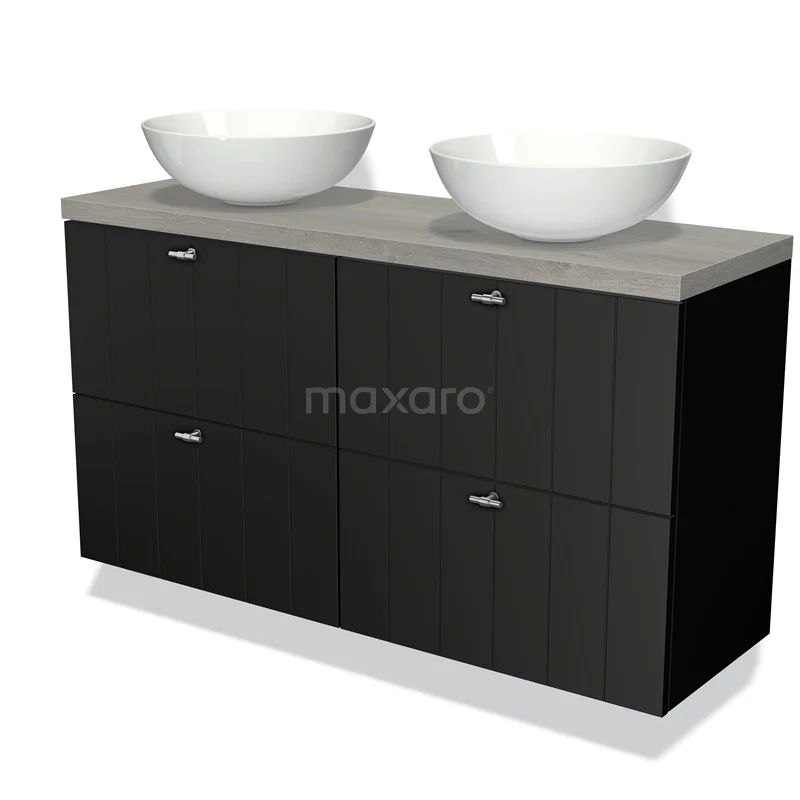 Modulo Plato Slim Badmöbel mit Aufsatzwaschbecken | 120 cm Matt Schwarz Lamelle front Graue Eiche blatt 4 Schubladen