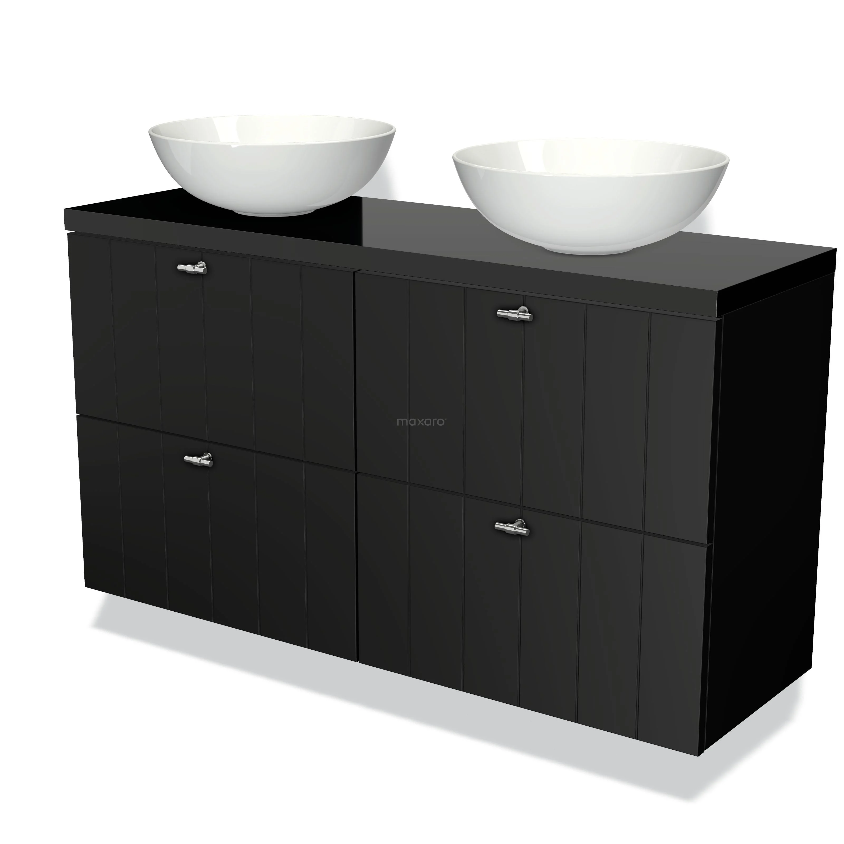 Modulo Plato Slim Badmöbel mit Aufsatzwaschbecken | 120 cm Matt Schwarz Lamelle front Hochglanz Schwarz blatt 4 Schubladen