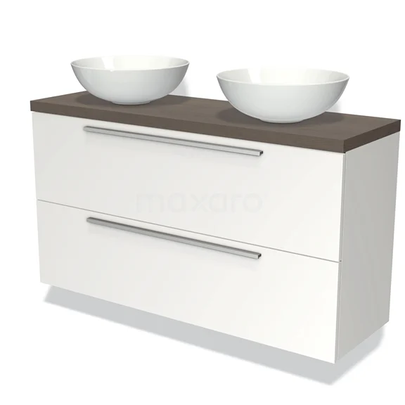 Modulo Plato Slim Badmöbel mit Aufsatzwaschbecken | 120 cm Matt Weiß Flach front Dunkelbraune Eiche blatt 2 übereinanderliegende Schubladen