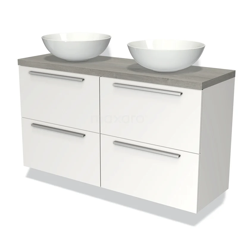 Weiße Badmöbelset mit doppelten Aufsatzwaschbecken, grauer Holzplatte und vier Schubladen, ideal für moderne Badezimmergestaltung.