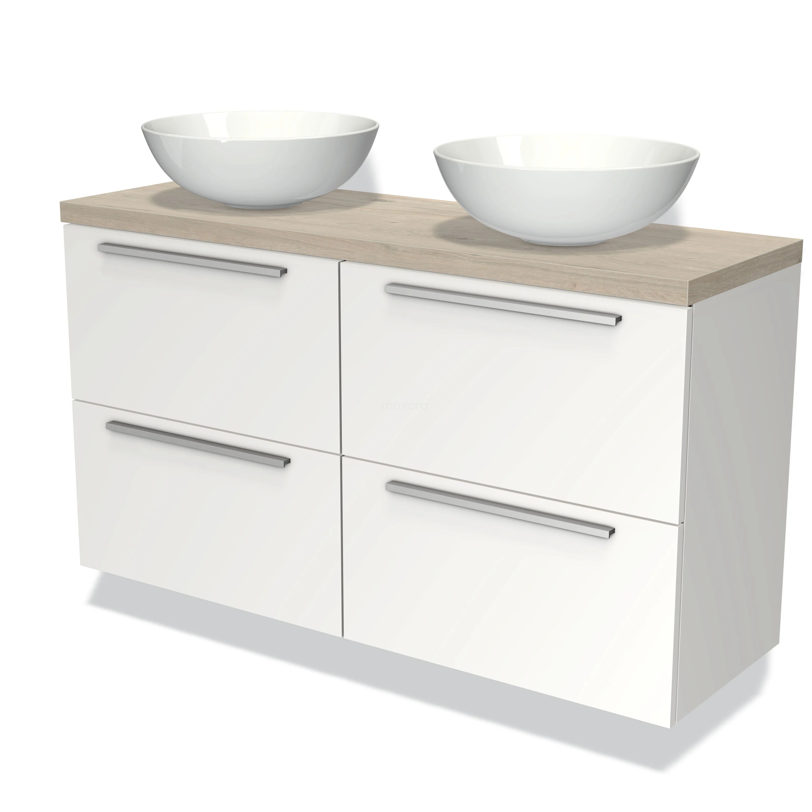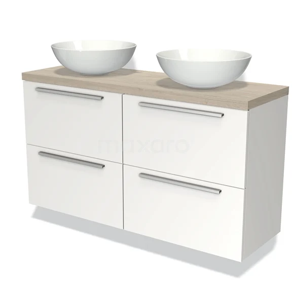 Modulo Plato Slim Badmöbel mit Aufsatzwaschbecken | 120 cm Matt Weiß Flach front Hellgraue Eiche blatt 4 Schubladen