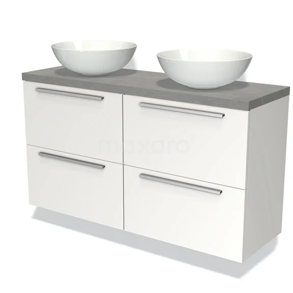 Modulo Plato Slim Badmöbel mit Aufsatzwaschbecken | 120 cm Matt Weiß Flach front Hellgrauer Beton blatt 4 Schubladen