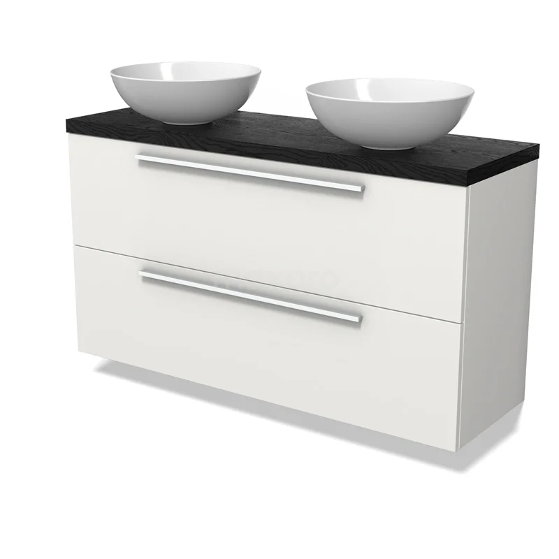 Modulo Plato Slim Badmöbel mit Aufsatzwaschbecken | 120 cm Matt Weiß Flach front Schwarze Eiche blatt 2 übereinanderliegende Schubladen