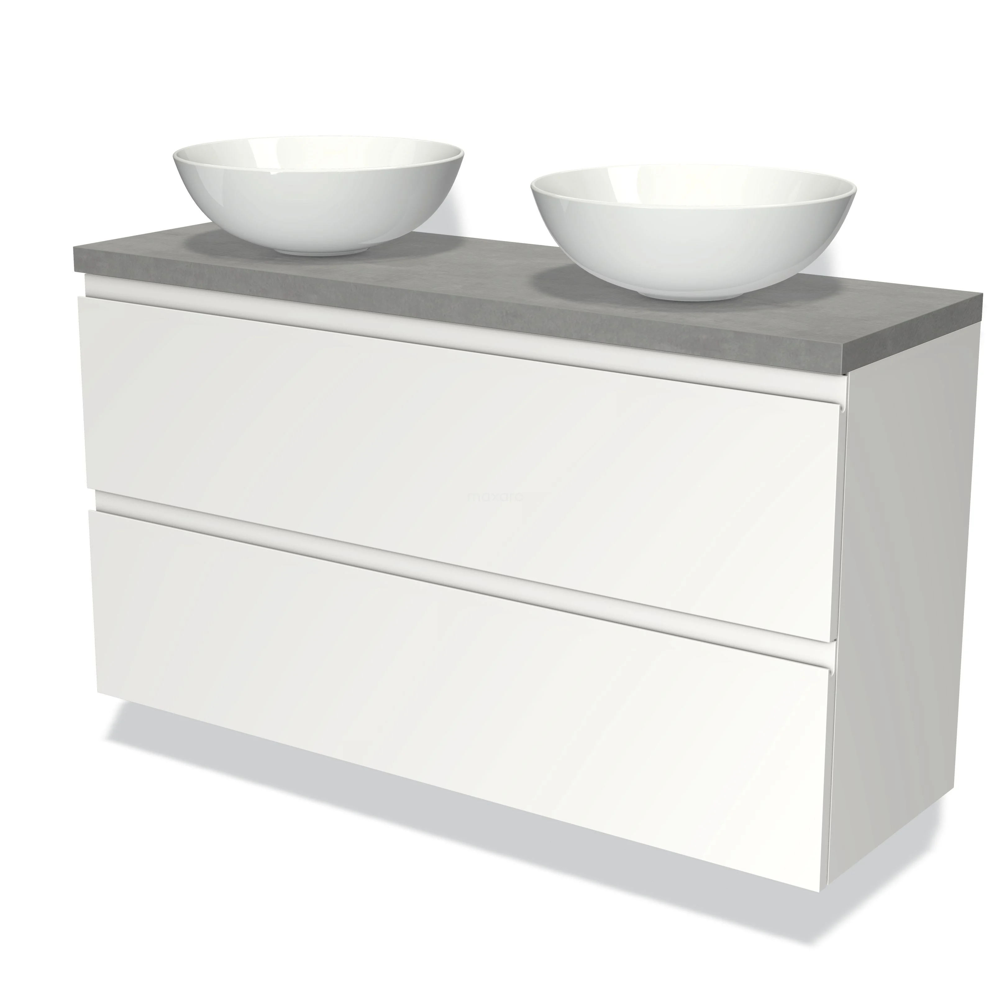 Modulo Plato Slim Badmöbel mit Aufsatzwaschbecken | 120 cm Matt Weiß Grifflos front Hellgrauer Beton blatt 2 übereinanderliegende Schubladen
