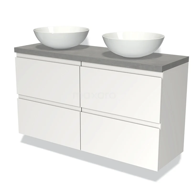 Modulo Plato Slim Badmöbel mit Aufsatzwaschbecken | 120 cm Matt Weiß Grifflos front Hellgrauer Beton blatt 4 Schubladen