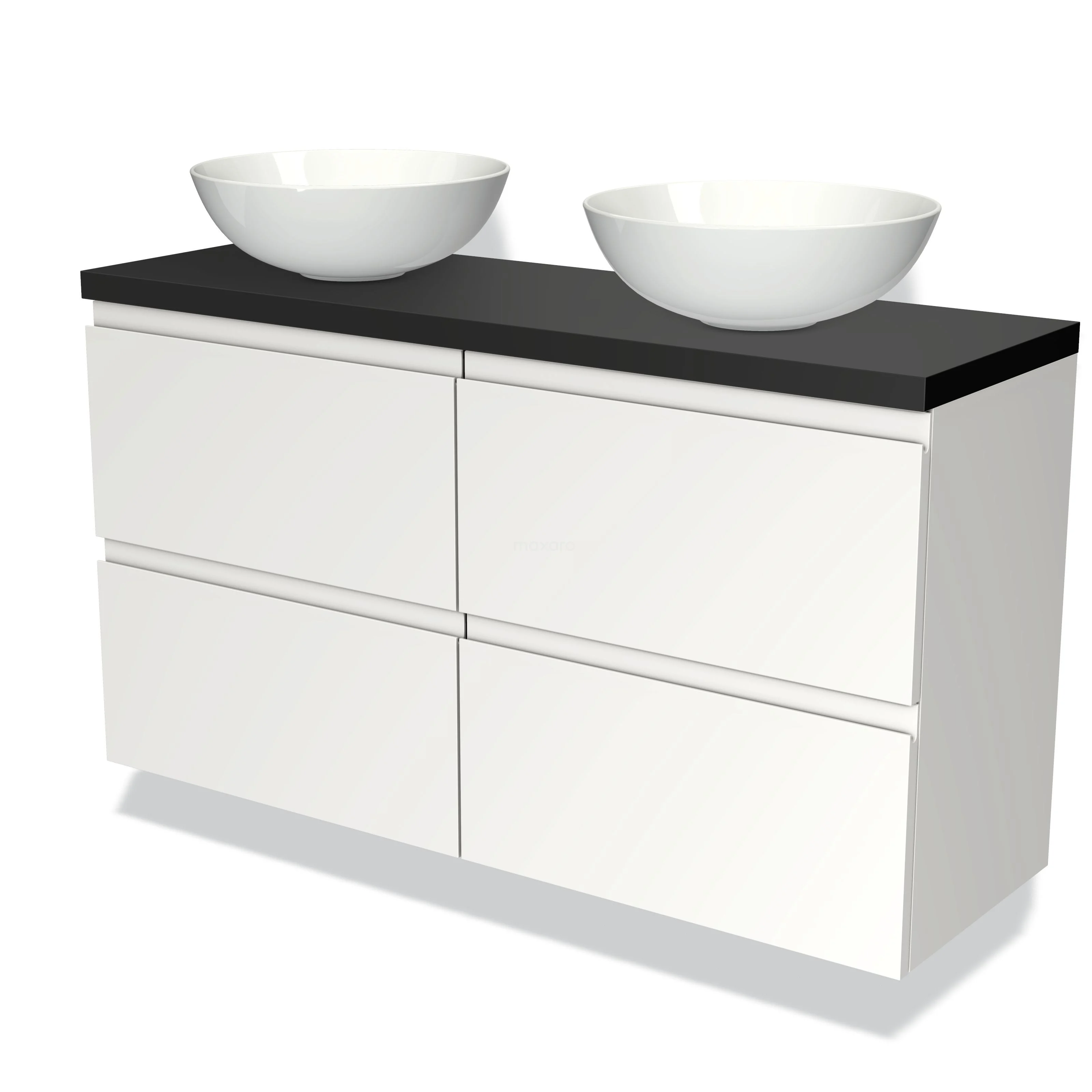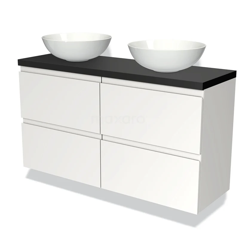 Modulo Plato Slim Badmöbel mit Aufsatzwaschbecken | 120 cm Matt Weiß Grifflos front Matt Schwarz blatt 4 Schubladen