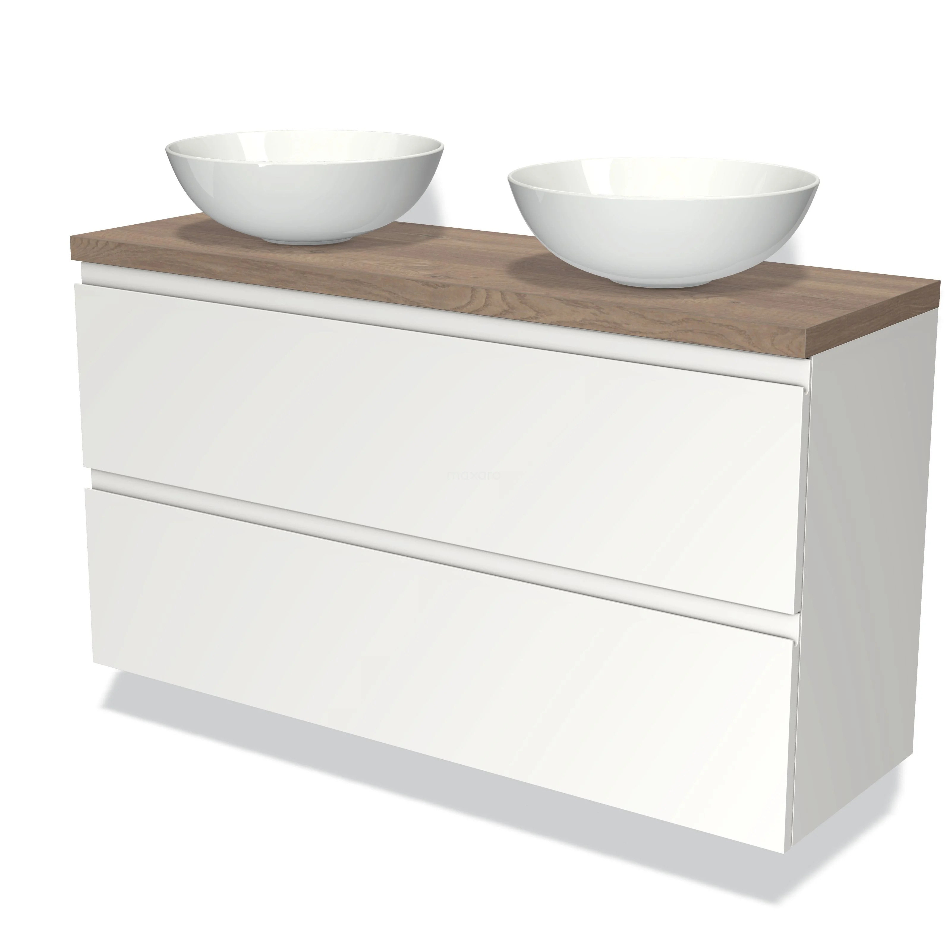 Modulo Plato Slim Badmöbel mit Aufsatzwaschbecken | 120 cm Matt Weiß Grifflos front Mittelbraune Eiche blatt 2 übereinanderliegende Schubladen