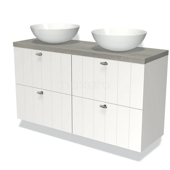 Modulo Plato Slim Badmöbel mit Aufsatzwaschbecken | 120 cm Matt Weiß Lamelle front Graue Eiche blatt 4 Schubladen