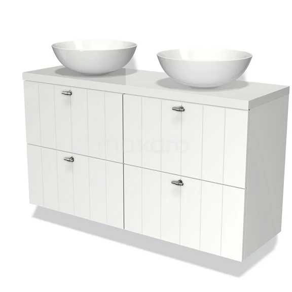 Modulo Plato Slim Badmöbel mit Aufsatzwaschbecken | 120 cm Matt Weiß Lamelle front Hochglanz Weiß blatt 4 Schubladen