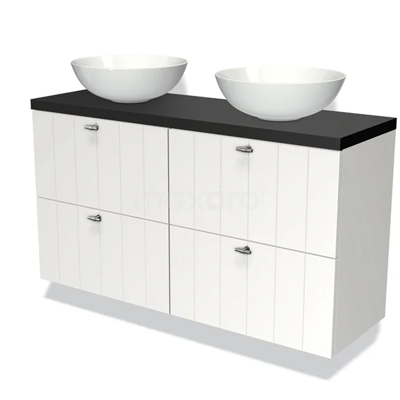 Modulo Plato Slim Badmöbel mit Aufsatzwaschbecken | 120 cm Matt Weiß Lamelle front Matt Schwarz blatt 4 Schubladen