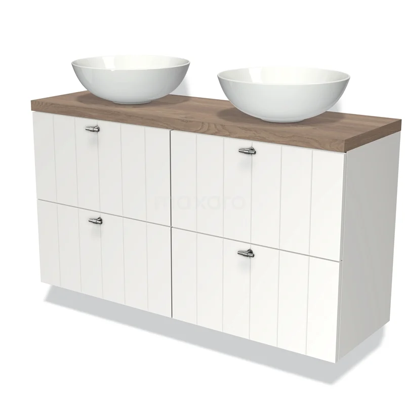 Modulo Plato Slim Badmöbel mit Aufsatzwaschbecken | 120 cm Matt Weiß Lamelle front Mittelbraune Eiche blatt 4 Schubladen