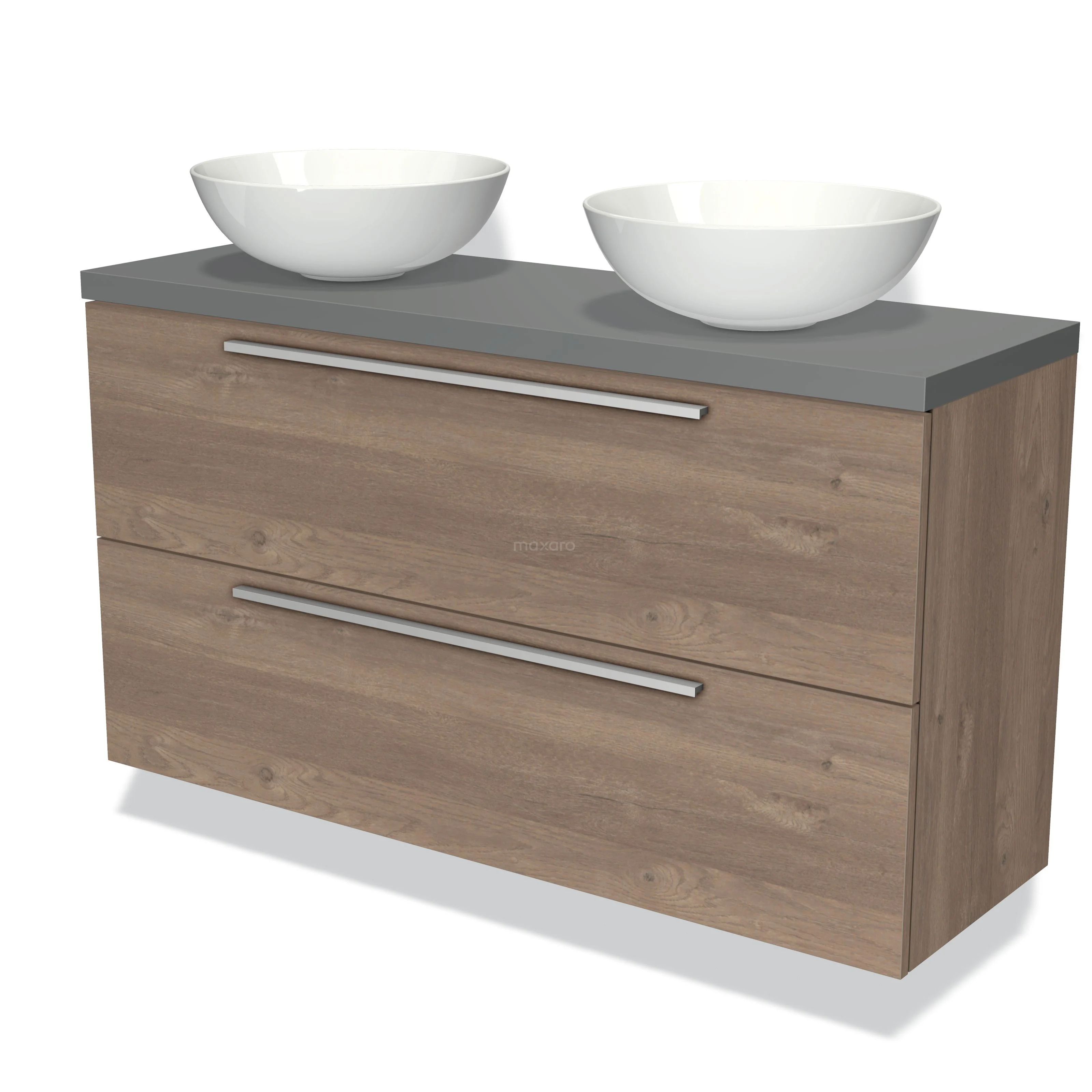 Modulo Plato Slim Badmöbel mit Aufsatzwaschbecken | 120 cm Mittelbraune Eiche Flach front Mittelgrau blatt 2 übereinanderliegende Schubladen