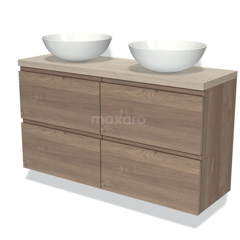 Modulo Plato Slim Badmöbel mit Aufsatzwaschbecken | 120 cm Mittelbraune Eiche Grifflos front Hellgraue Eiche blatt 4 Schubladen