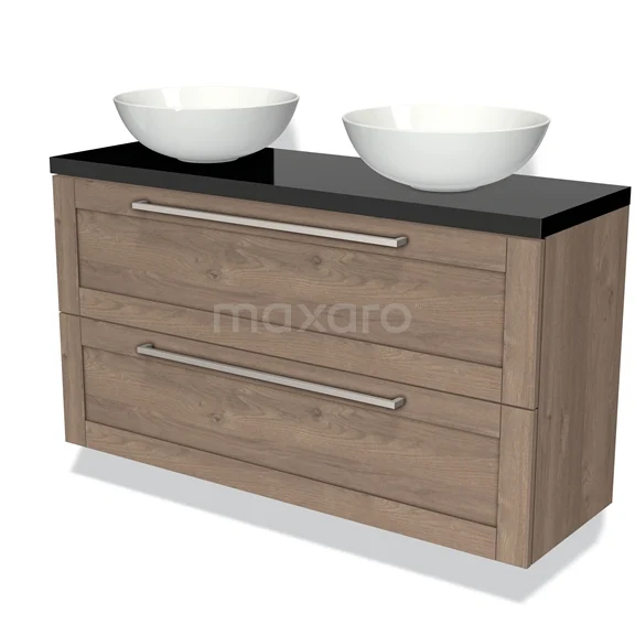 Modulo Plato Slim Badmöbel mit Aufsatzwaschbecken | 120 cm Mittelbraune Eiche Rahmen front Hochglanz Schwarz blatt 2 übereinanderliegende Schubladen
