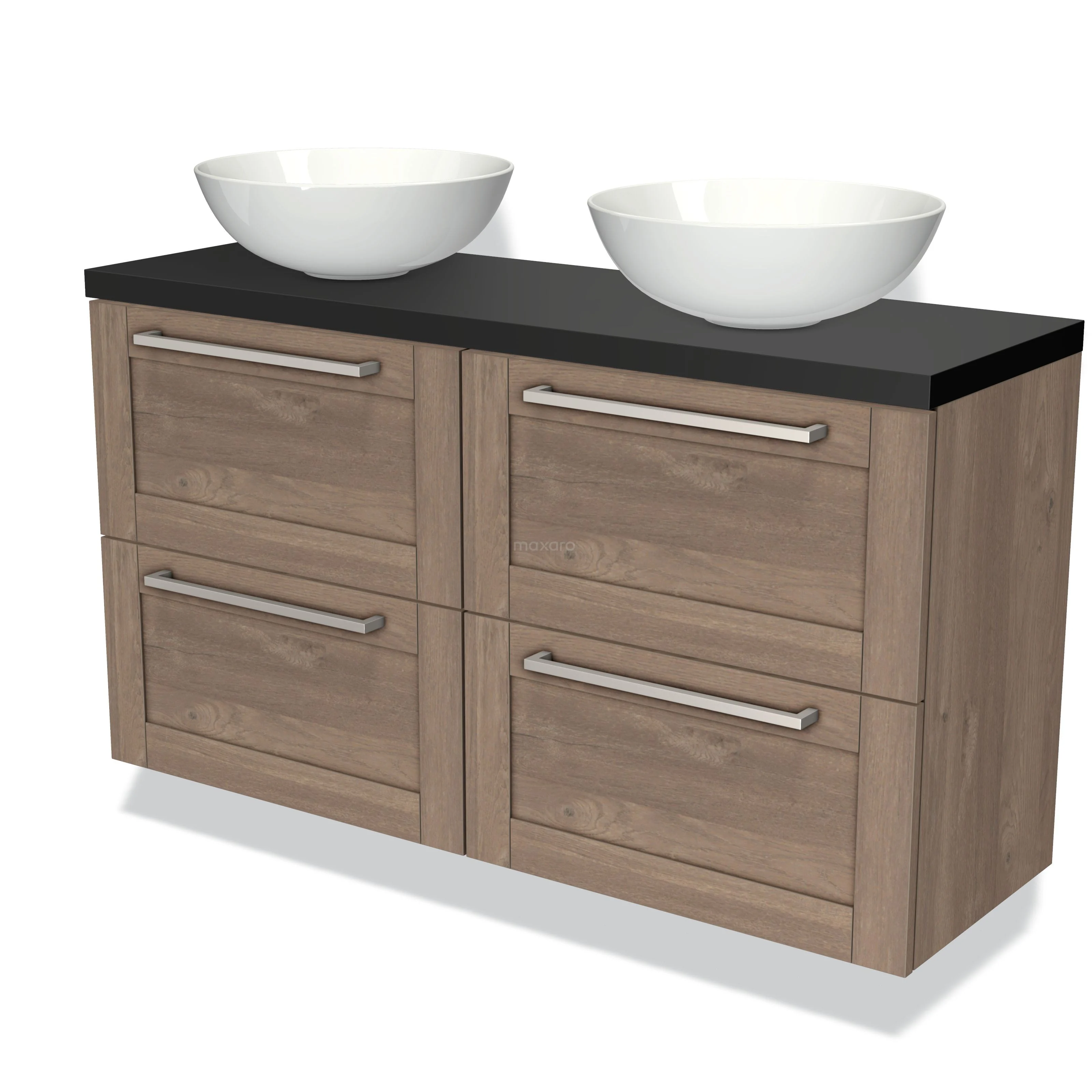 Modulo Plato Slim Badmöbel mit Aufsatzwaschbecken | 120 cm Mittelbraune Eiche Rahmen front Matt Schwarz blatt 4 Schubladen