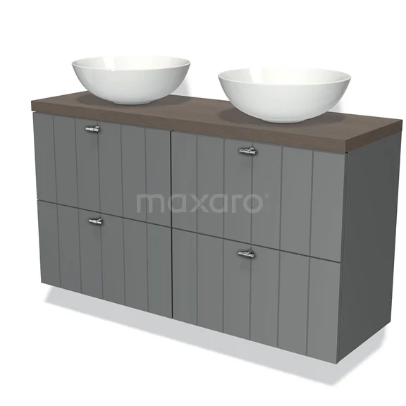 Modulo Plato Slim Badmöbel mit Aufsatzwaschbecken | 120 cm Mittelgrau Lamelle front Dunkelbraune Eiche blatt 4 Schubladen