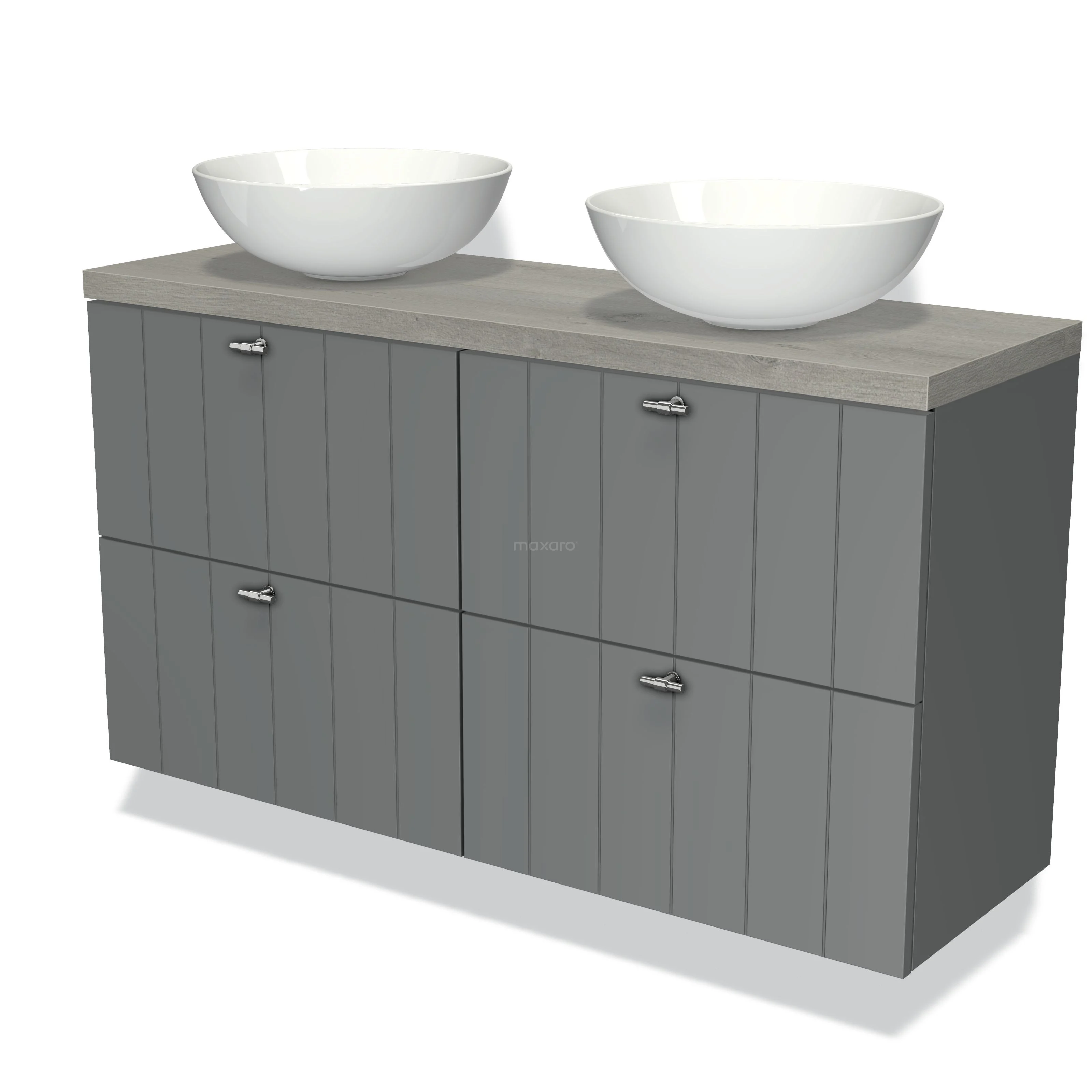Modulo Plato Slim Badmöbel mit Aufsatzwaschbecken | 120 cm Mittelgrau Lamelle front Graue Eiche blatt 4 Schubladen