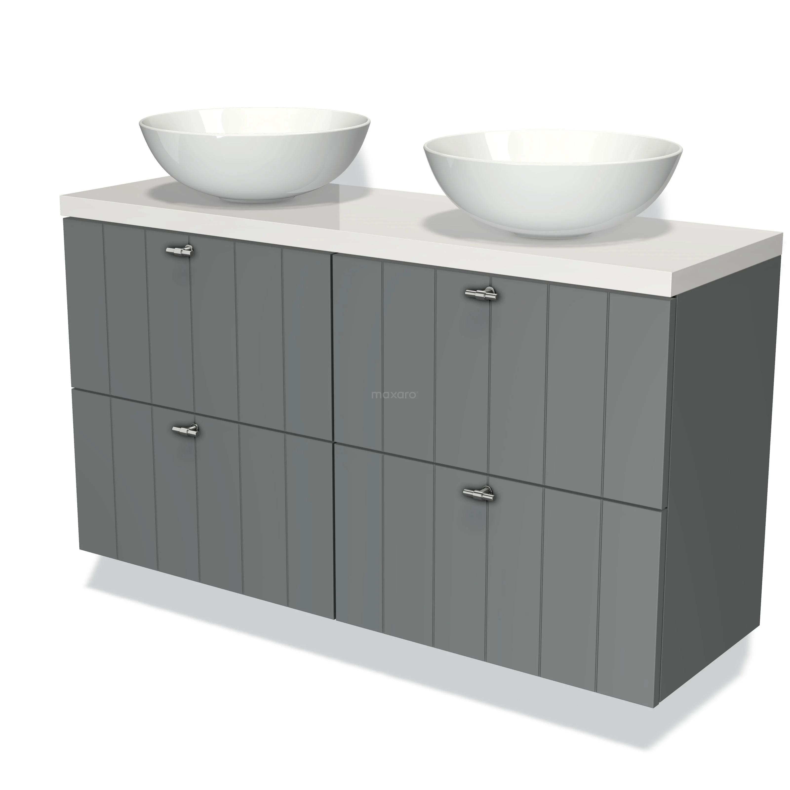 Modulo Plato Slim Badmöbel mit Aufsatzwaschbecken | 120 cm Mittelgrau Lamelle front Hochglanz Weiß blatt 4 Schubladen
