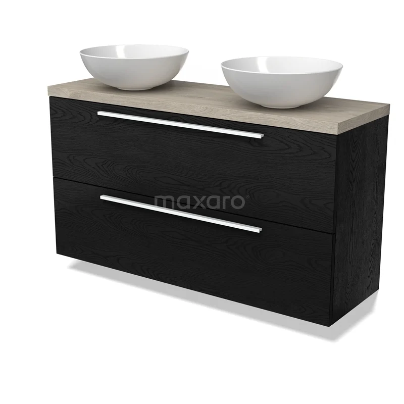 Modulo Plato Slim Badmöbel mit Aufsatzwaschbecken | 120 cm Schwarze Eiche Flach front Hellgraue Eiche blatt 2 übereinanderliegende Schubladen